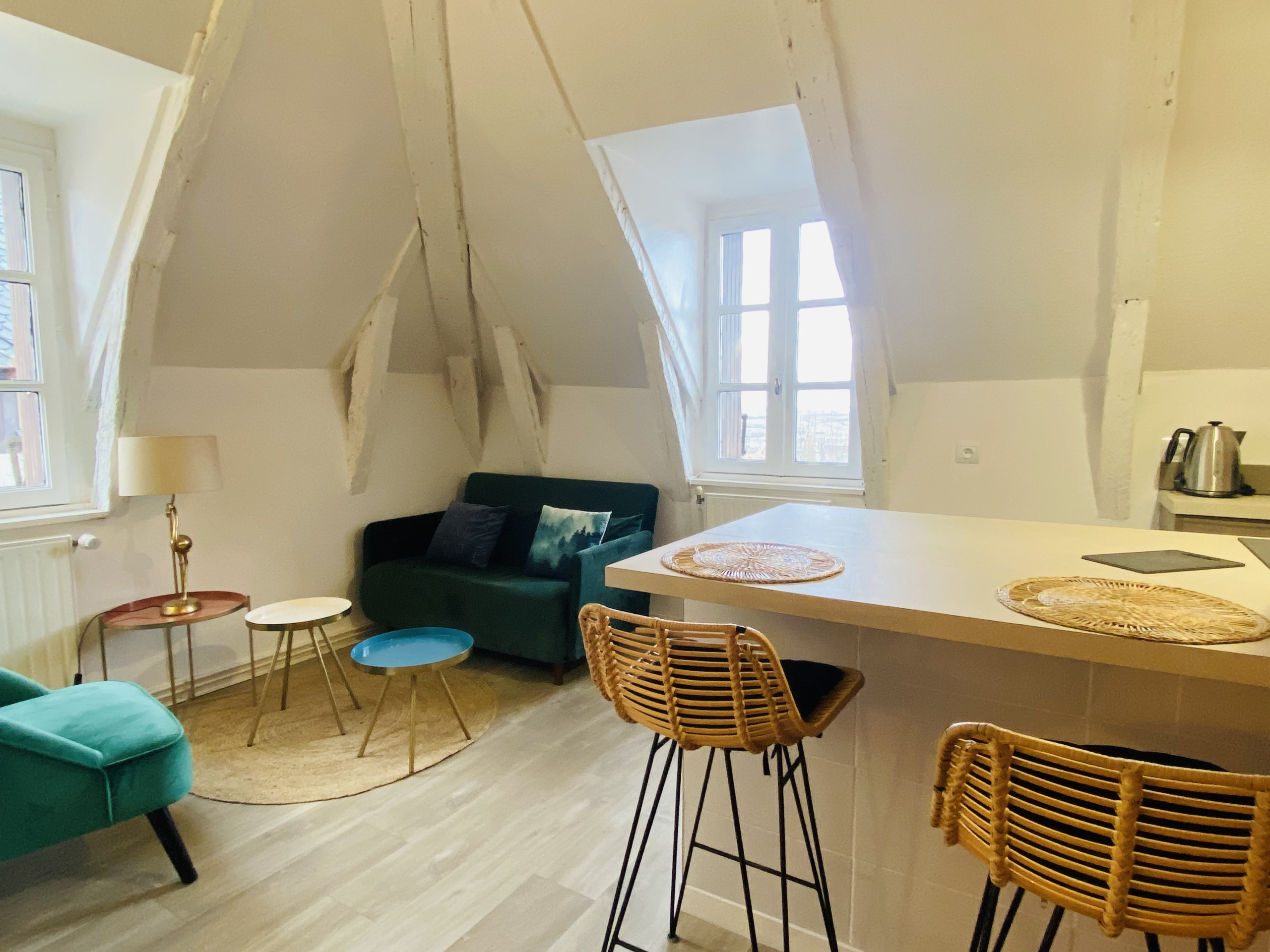 El apartamento seduce por sus hermosos volúmenes, su suelo de madera antiguo y su decoración cuidada, combinando el encanto de antaño con la comodidad moderna. Luminoso y agradable de vivir, es ideal para relajarse después de un día de visitas o de trabajo.