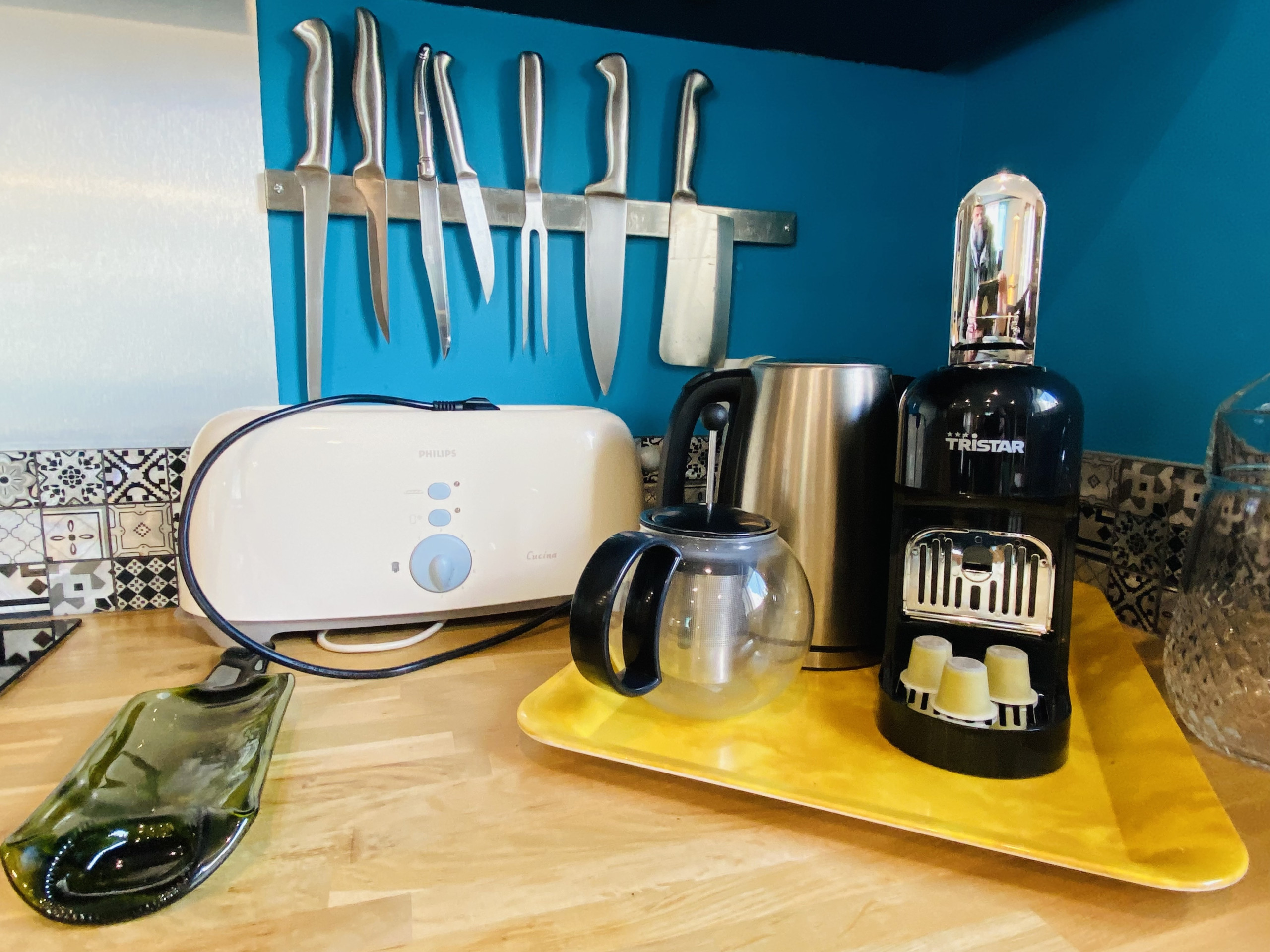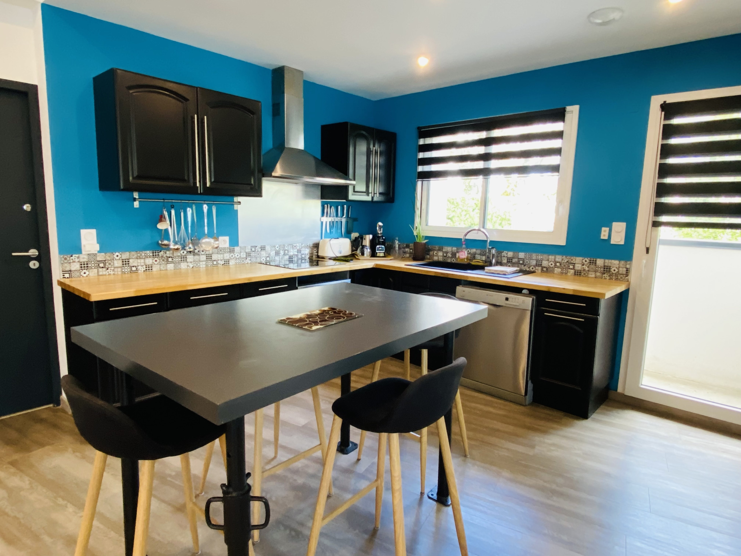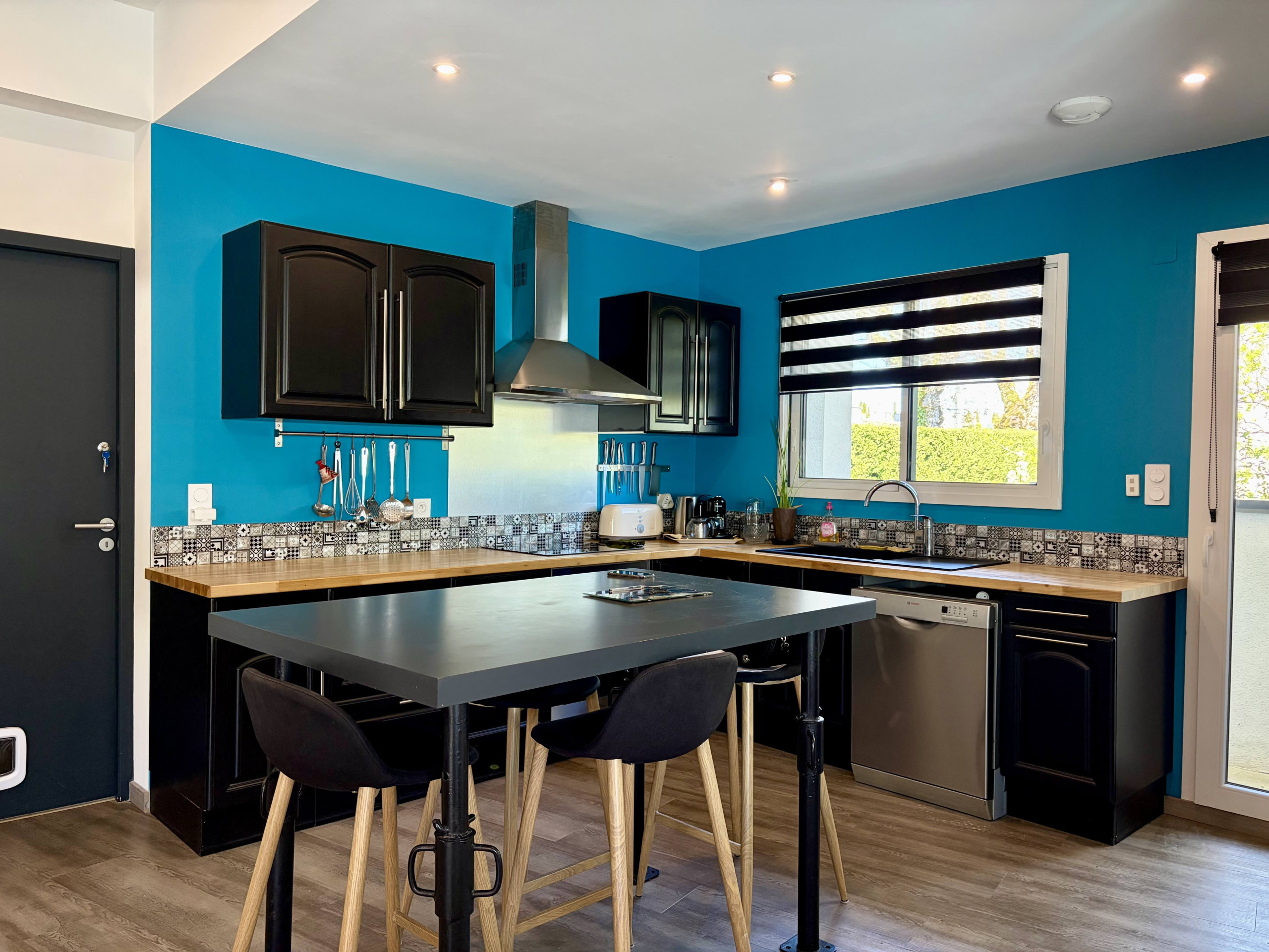 La cocina americana, de inducción, está equipada con nevera, microondas, horno, congelador, lavavajillas, vajilla/cubertería, utensilios/cocina, cafetera, tostadora y hervidor de agua.