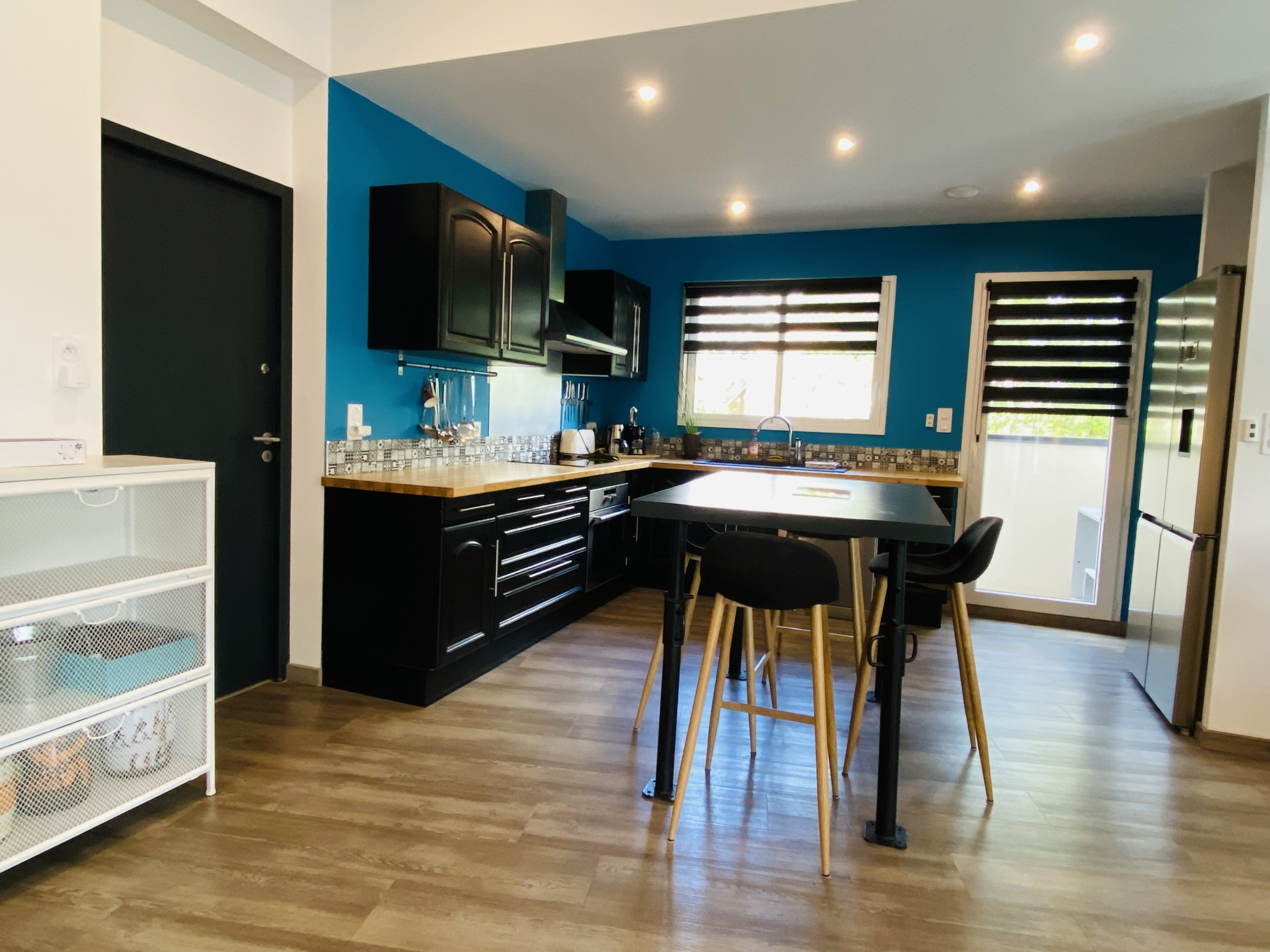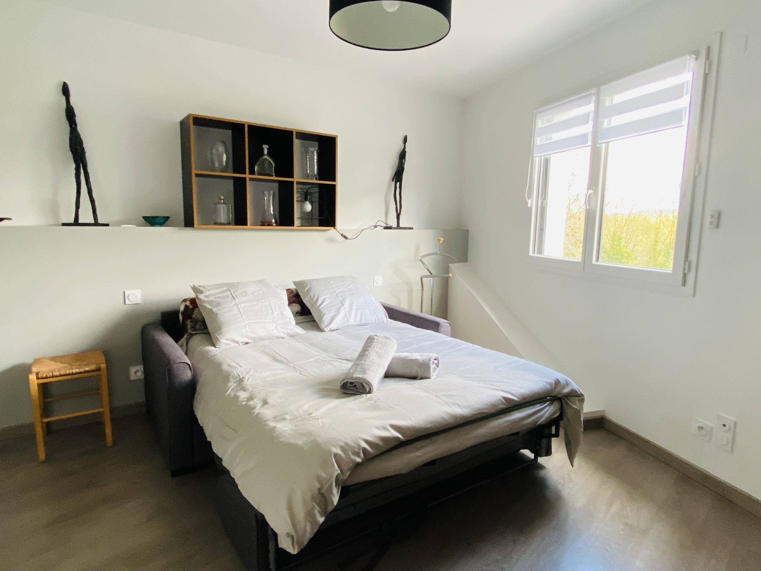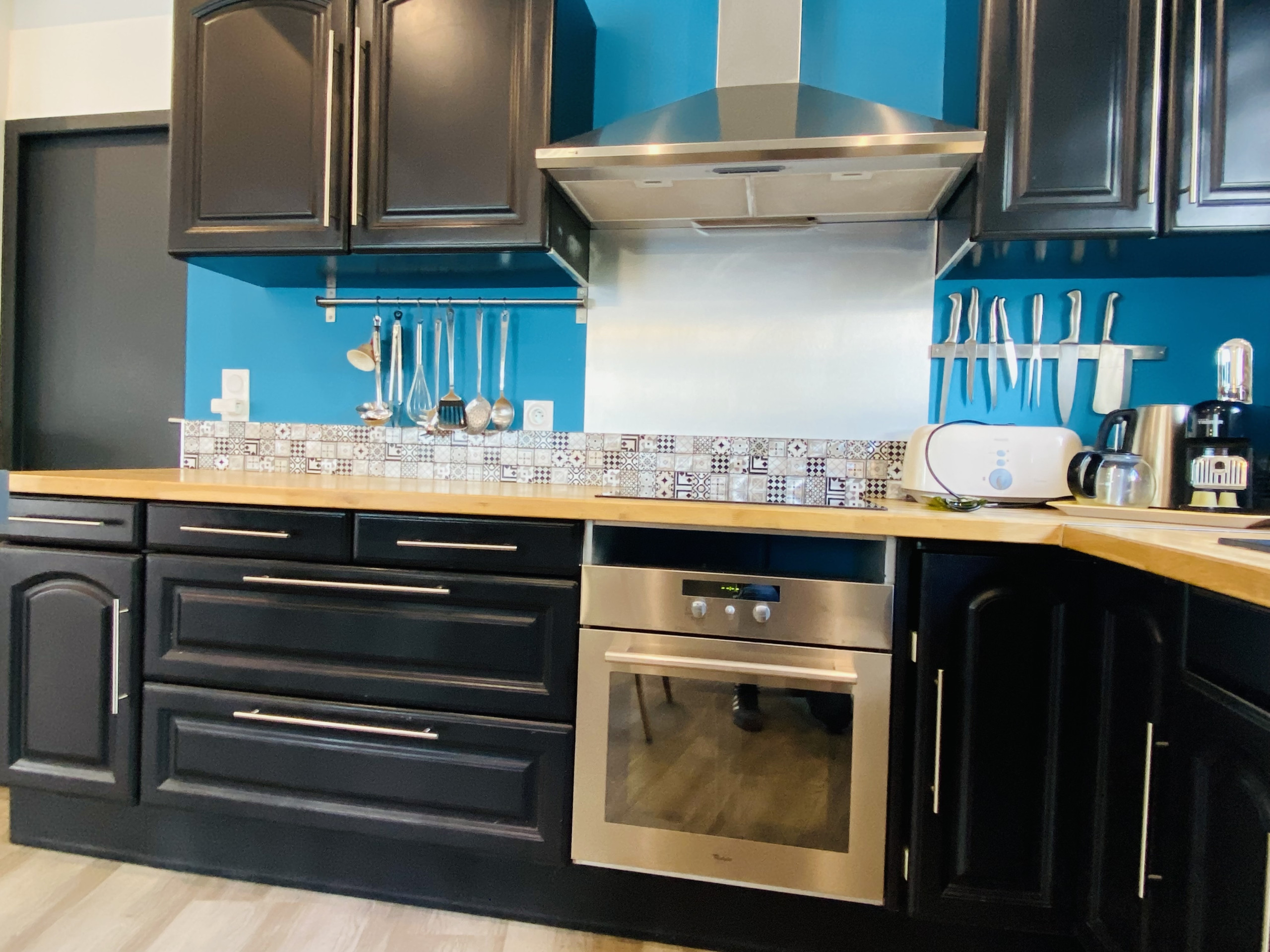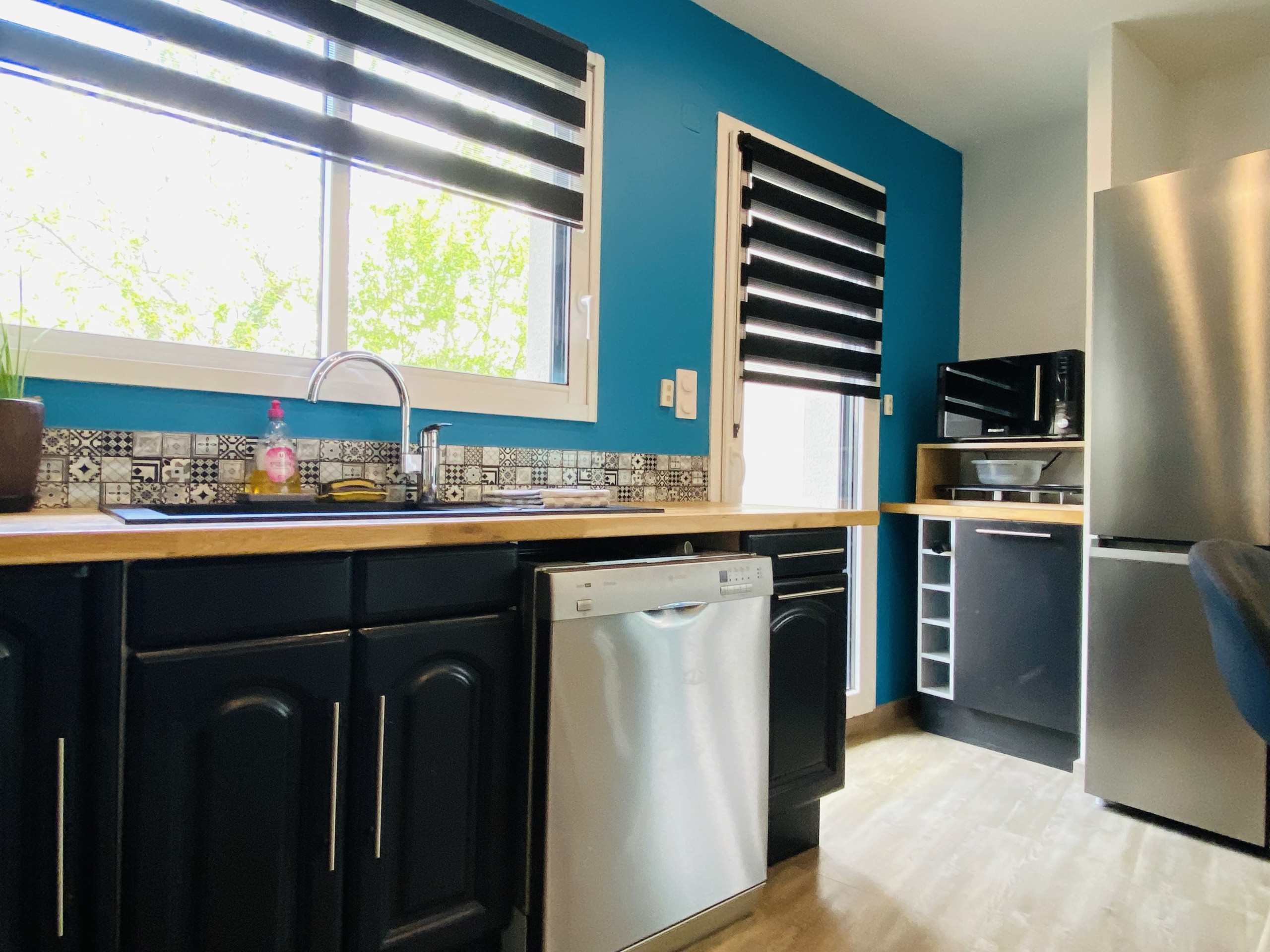 La cocina americana, de inducción, está equipada con nevera, microondas, horno, congelador, lavavajillas, vajilla/cubertería, utensilios/cocina, cafetera, tostadora y hervidor de agua.