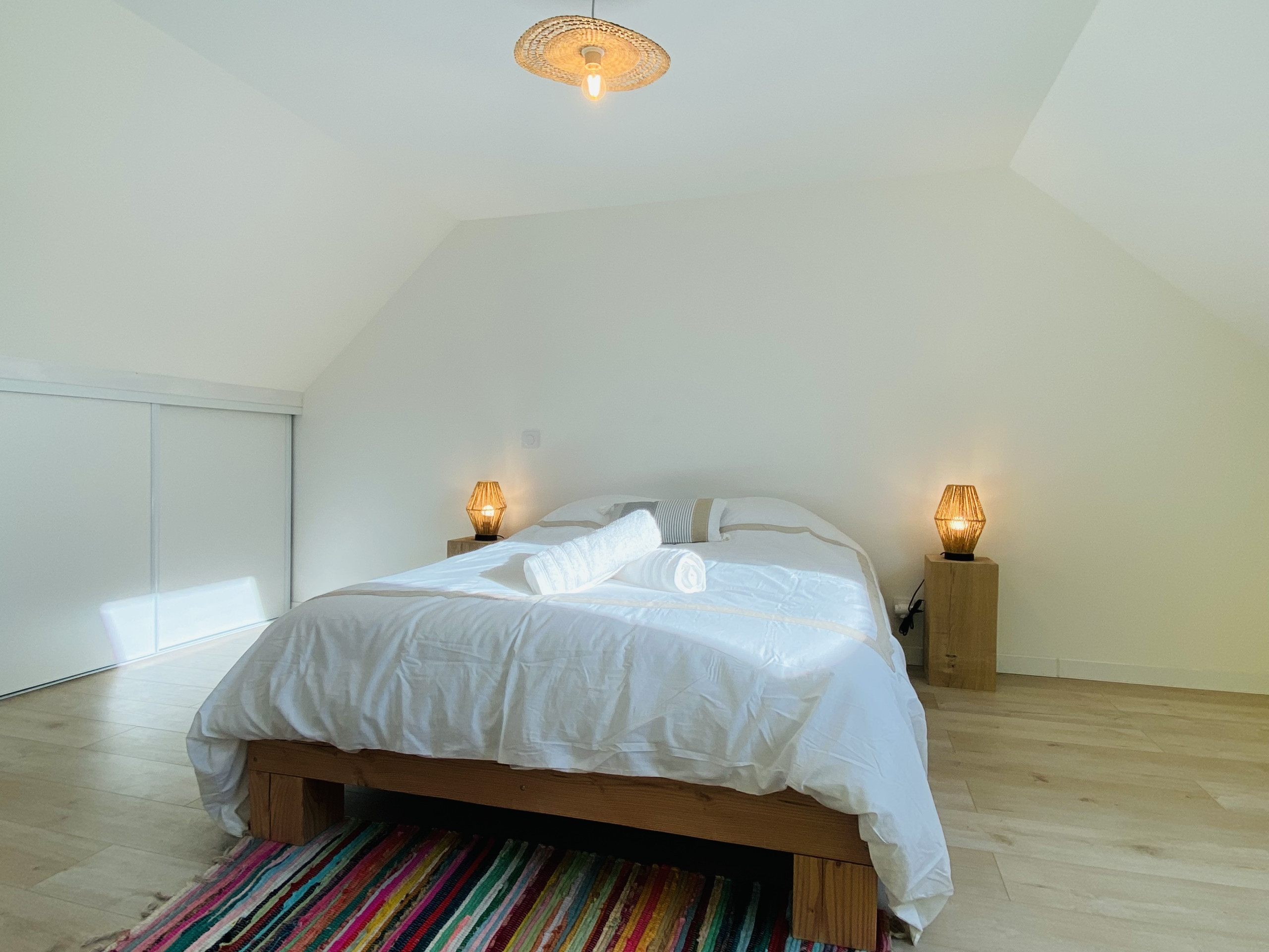 Il comprend également un salon lumineux, une cuisine entièrement équipée, une salle de douche et un WC au rez-de-chaussée et vous trouverez une salle de bain et un WC à l’étage.
