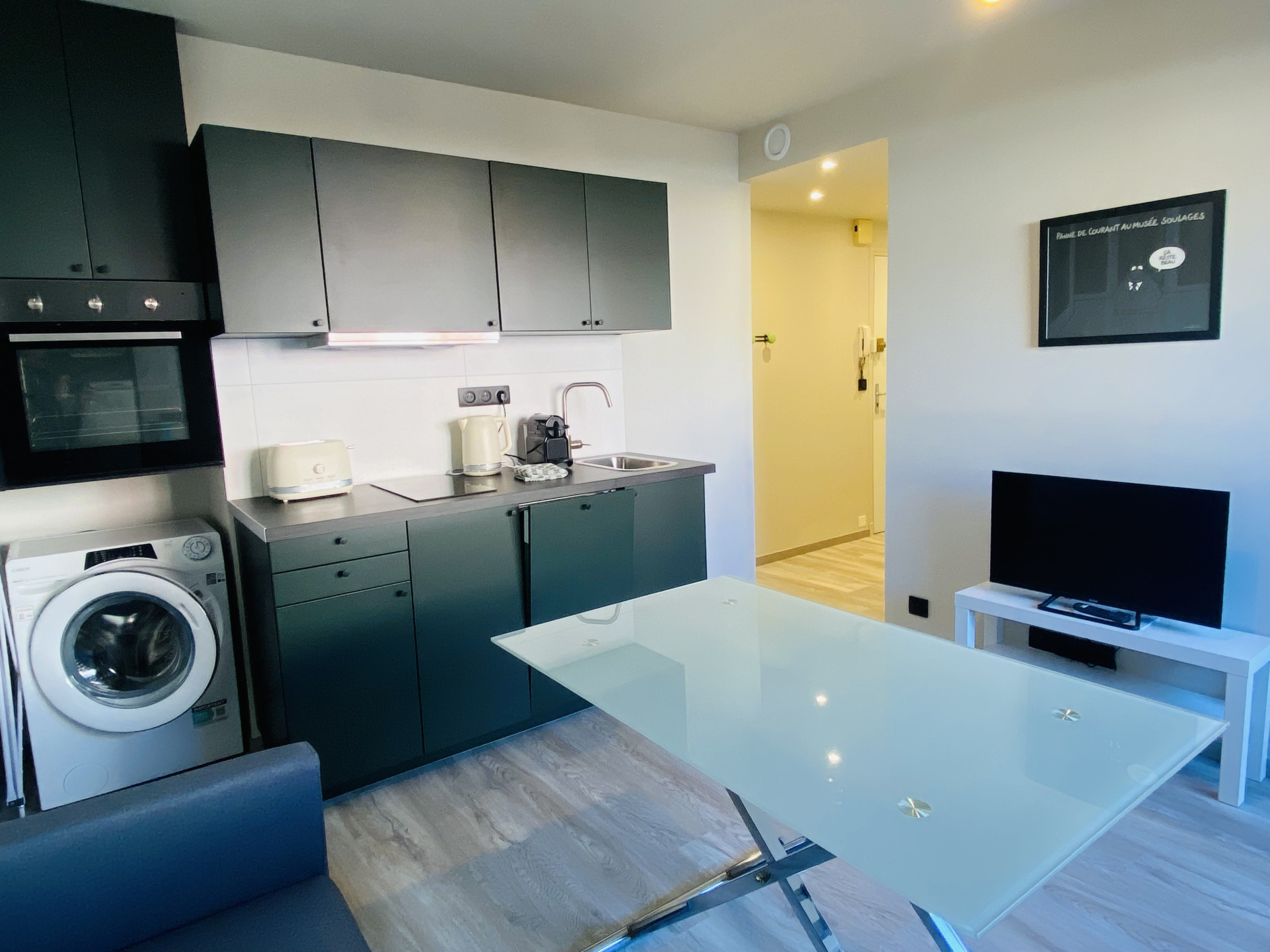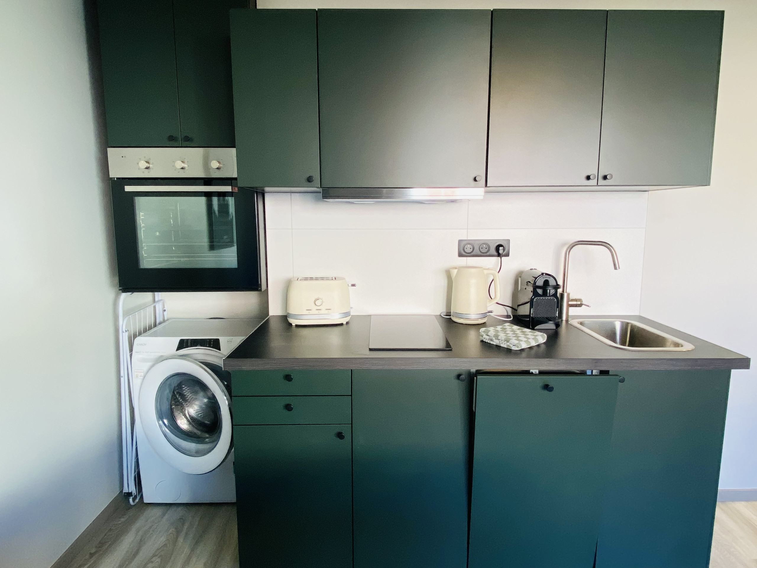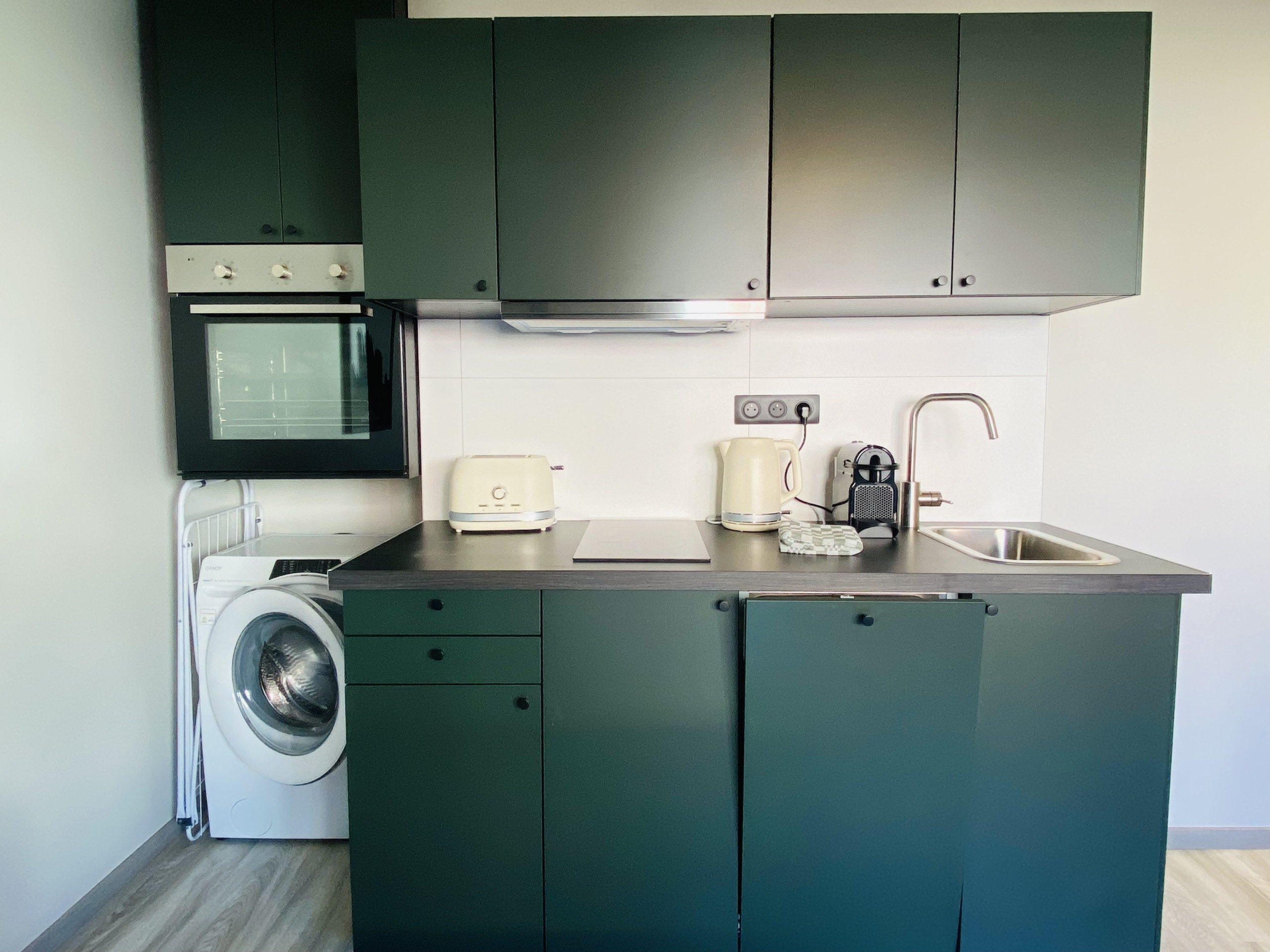 - Cuisine américaine équipée : plaque de cuisson, four, micro-ondes, réfrigérateur, cafetière, vaisselle complète