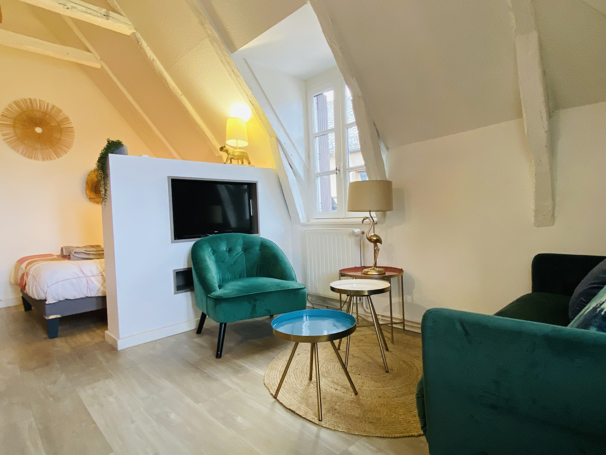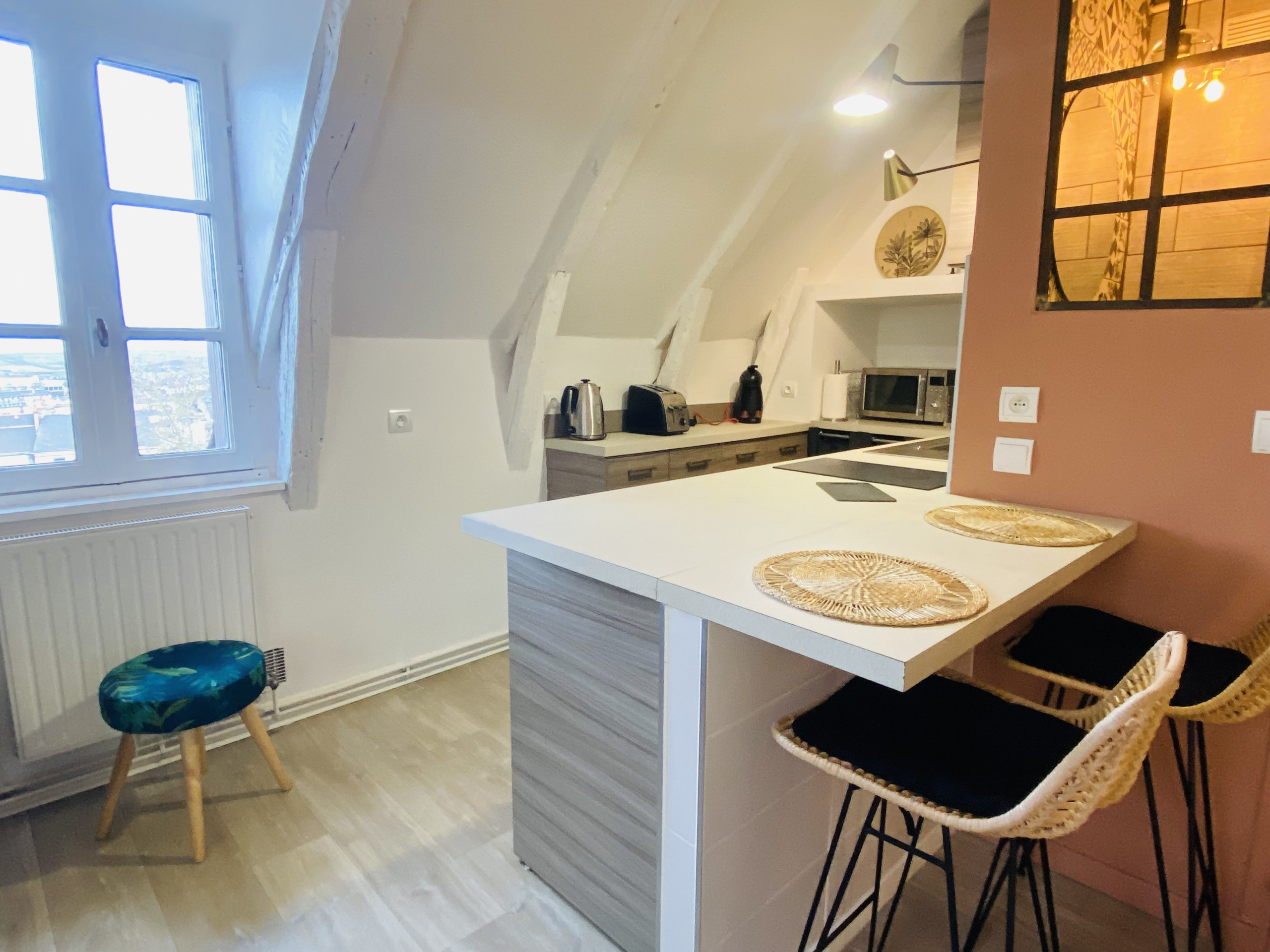 Ce logement séduit par son caractère, ses poutres apparentes et son atmosphère cosy.